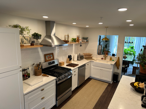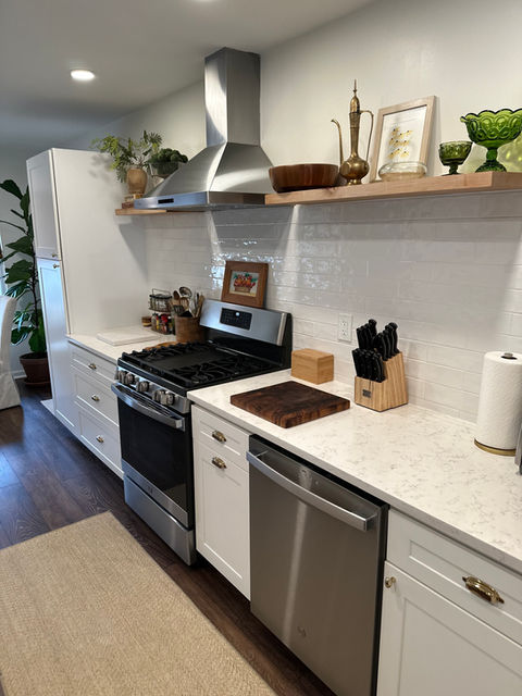 We transformed this outdated kitchen into a modern and functional space. We installed new flooring, recessed lighting, cabinets, countertops, wall shelving, backsplash, and added a custom range hood for proper ventilation. The new appliances and lighting fixtures completed the look and made the kitchen a perfect spot for cooking and entertaining.